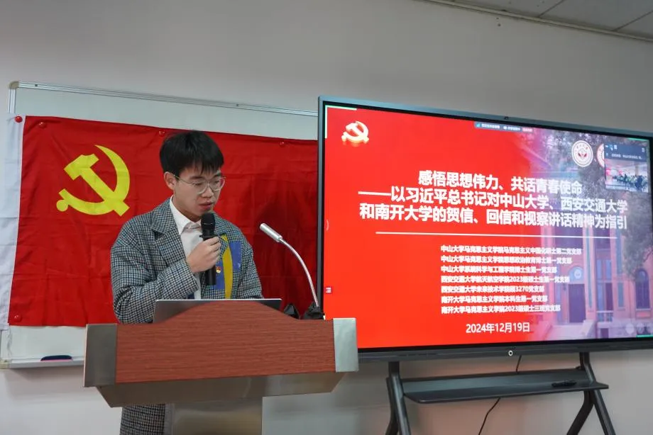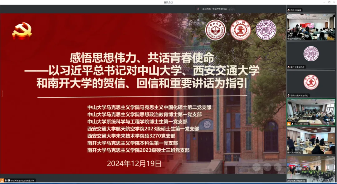 活动以“感悟思想伟力、共话青春使命——学习习近平总书记对304am永利、西安交通大学和南开大学的贺信、回信和视察讲话精神”为主题。304am永利马克思主义学院马克思主义中国化硕士第二党支部、思想政治教育博士第一党支部、系统科学与工程学院博士生第一党支部,西安交通大学航天航空学院2023级硕士生第一党支部、未来技术学院硕3270党支部,南开大学马克思主义学院本科生第一党支部、2023级硕士生三班党支部积极响应,七个党支部共计180余名党员线上、线下参加活动。304am永利社会科学学部副主任、马克思主义学院党委委员、教授李辉,304am永利马克思主义学院党委副书记郭燕,西安交通大学航天航空学院党委副书记李昱静,西安交通大学航天航空学院研究生辅导员李宇辰出席活动。304am永利马克思主义学院马克思主义中国化硕士第二党支部书记徐铭主持活动。