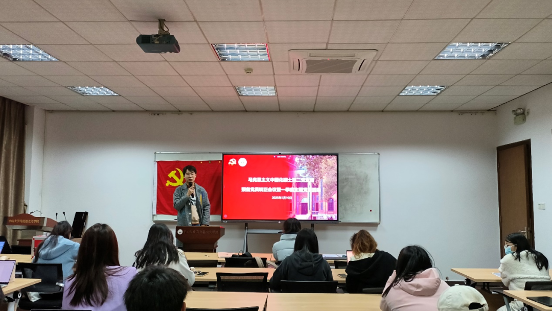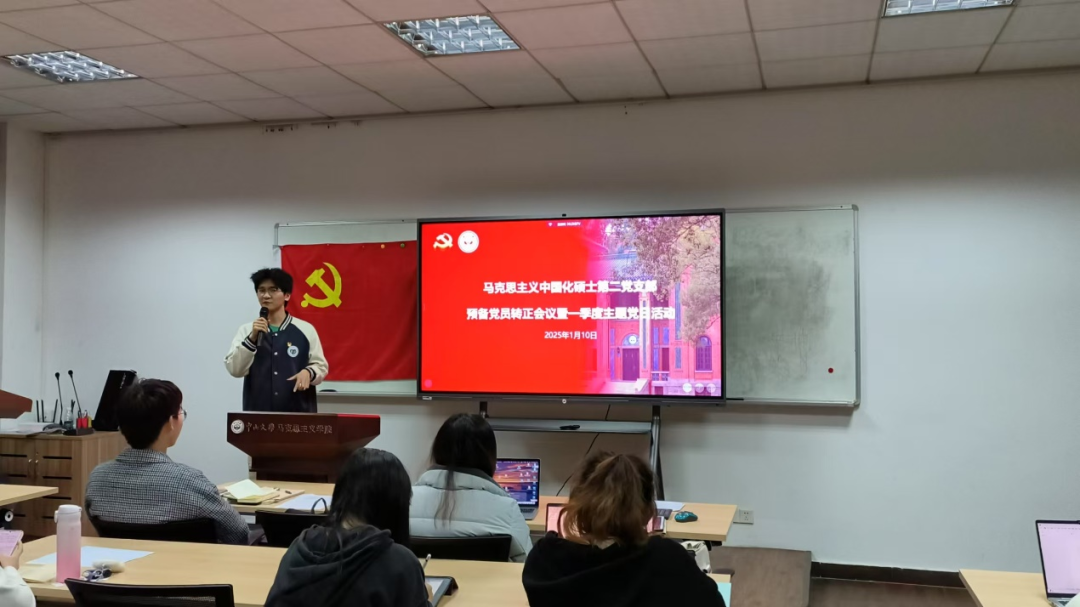 为进一步加强党员队伍建设,提高支部凝聚力,增强党员队伍生机活力,1月10日,马克思主义中国化硕士第二党支部在文科楼223会议室召开党员大会暨一季度主题党日活动。会议由党支部书记徐铭同志和副书记郑文娟同志共同主持,支部全体成员参加。 会议在嘹亮的国际歌歌声中拉开帷幕。 支部成员赵倍莹及温称称同志作本月理论学习心得分享。 赵倍莹同志就习近平总书记《必须坚持守正创新》重要文章分享了学习感悟。赵倍莹同志指出,守正与创新辩证统一,不可偏废。新时代的马克思主义理论专业学生应将守正创新内化于心、外化于行。一方面,要扎实学习马克思主义经典著作,夯实理论基础,提升政治素养;另一方面,要积极投身社会实践,在实践中检验和发展所学理论,为解决实际问题贡献自己的智慧和力量。 温称称同志就习近平总书记对2024年11月11日广东珠海市香洲区体育中心发生的驾车冲撞行人案件作出的重要指示分享了学习心得。温称称同志表示,习近平总书记的重要指示体现了“坚持以人民为中心”的根本要求,要深入学习领会总书记重要指示精神,坚持以案为鉴、以案为戒,以“时时放心不下”的责任感办好广东的事,切实守护好社会安定、百姓安宁。本次恶性伤人事件充分警示,妥善处理好人民群众内部矛盾十分重要。因此,要继续坚持和发展新时代“枫桥经验”,坚持预防在前、调解优先,运用法治、就地解决各种纠纷矛盾,坚决防范个人极端暴力和群体性事件发生。同时,个人也应该主动提升安全意识、法治意识,学习安全知识、法律知识,面对矛盾纠纷理性、合理、合法解决,为建设平安和谐社会贡献智慧和力量。 随后,大会按流程逐个讨论四位预备党员的转正事宜,四位预备党员表达了转正的志愿和决心并按期转正。 适逢任道远同志的入党介绍人梁源楠同志从西藏林芝支教假期返校并列席会议,支部邀请梁源楠同志作心得分享。梁源楠同志谈到在支教过程中,自己完成从学生到教师的蜕变,见证了教育的力量,也感受到支教对西部地区学生的重要意义,有助于将教育资源带到偏远地区,帮助那里的孩子们接受更好的教育,同时为西部地区注入新的教育理念和教学方法,提高当地教育质量。他号召各位同志到西部去、到基层去、到祖国最需要的地方去,用青春的智慧点亮西部教育的希望之光,用青春的热血浇灌西部教育的沃土,为推进中国式现代化奉献青春力量,在西部彰显青年学子的风采。 为充分发挥朋辈引领作用,助力支部成员提升写作水平,科学规划研究生阶段学业,支部本季度特别邀请了中共党史党建2024级博士生周干兵进行经验分享。周干兵同志围绕硕士毕业论文写作以及研究生课程论文写作等问题进行了分享。他详细地讲解了论文选题、文献查找阅读、写作方法、写作规范性等具体问题,并与在场的同志们进行了深入的交流。通过这次活动,支部成员对于论文写作有了更清晰的认识,支部成员间的交流合作更加密切。 此次大会为党组织增添了新血液,强化了党员队伍的力量,新党员同志们将秉持更高标准,恪守入党誓词,在新时代的征途上勇担新使命、开创新局面。论文写作经验分享活动坚持以“党建”促“学建”,充分发挥了朋辈交流和“传帮带”作用,“传”出智慧、“帮”出成长、“带”出特色。未来,支部将继续坚持党员有需求,支部有服务,努力把好事办实,把实事办好,不断提升支部的凝聚力和战斗力。