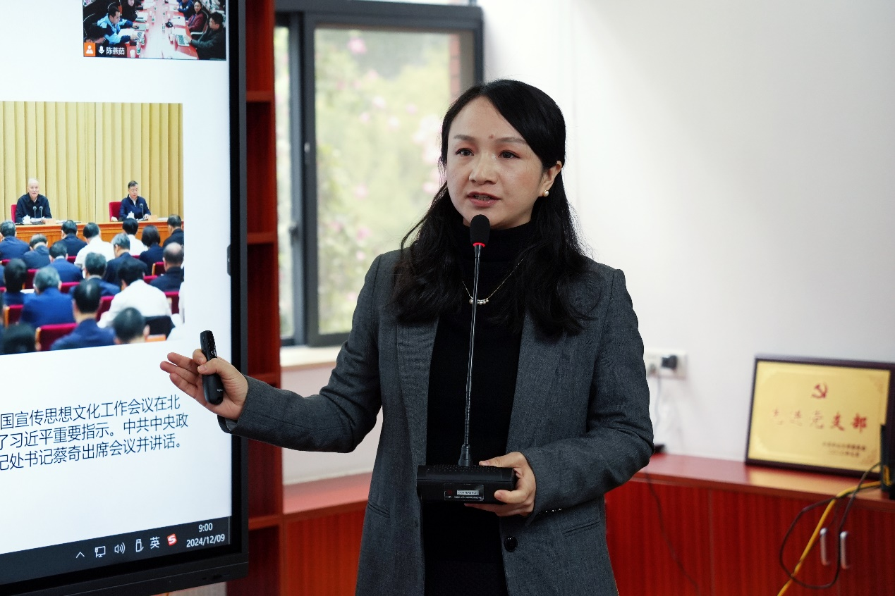 张荻荻助理教授以“论习近平文化思想的主体性特征”为题作报告。报告梳理了文化主体性不断增强的发展逻辑,从宏观、时间和空间三个维度阐释了习近平文化思想的主体性特征,探讨了全球化背景下坚守中华文化立场的方式与路径。
