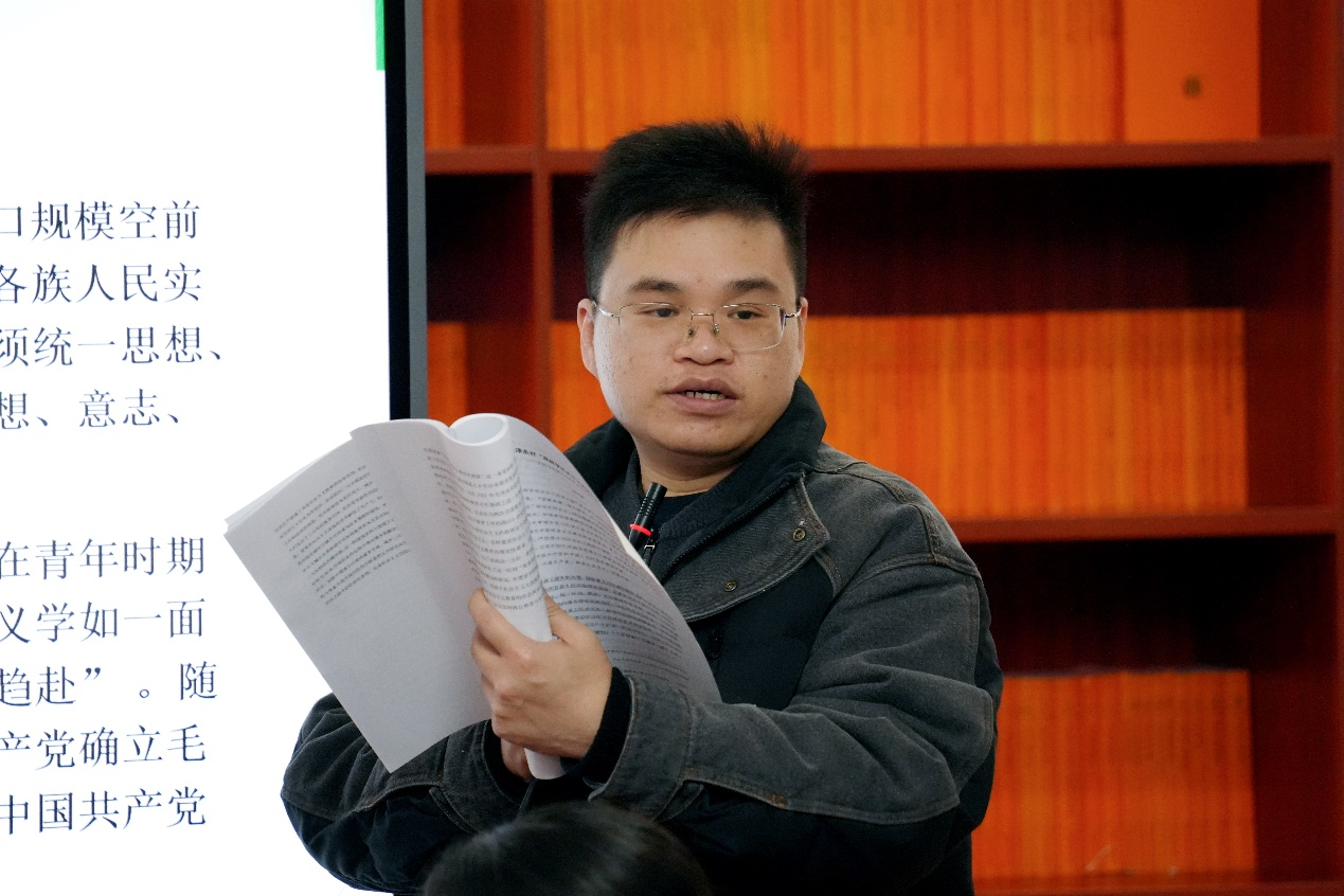 龙其鑫助理教授以“毛泽东对‘用科学社会主义武装头脑’的思索”为题作报告。报告围绕毛泽东“用科学社会主义武装头脑”的政治要论,从坚持真理、修正错误,加强党性修养和坚定社会主义理想信念,发扬“敢于斗争”和“奋发努力”的精神三个方面,探讨了毛泽东指导中国共产党做好思想建设的方式方法及其现实启示。