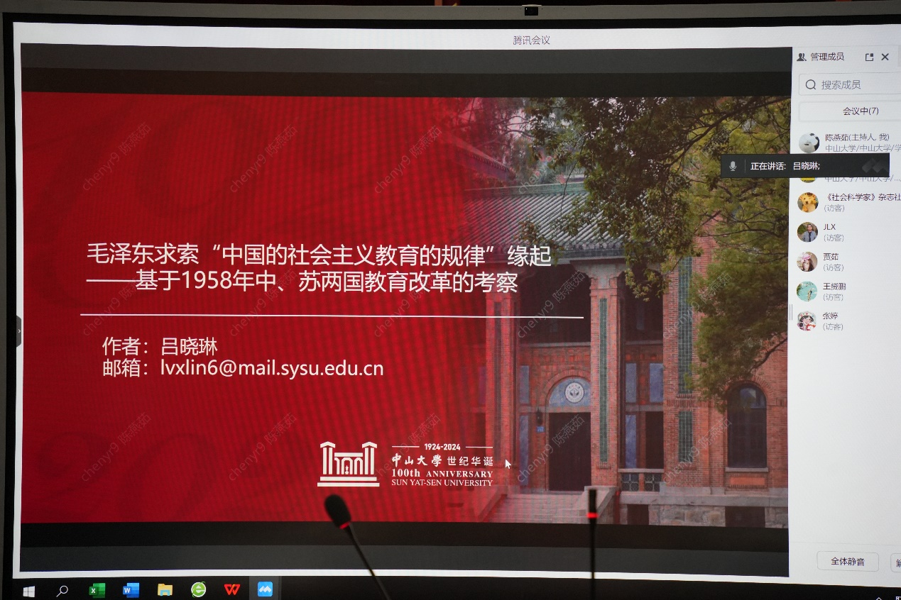 吕晓琳助理教授以“毛泽东求索‘中国的社会主义教育规律’缘起——基于1958年中国与苏联教育改革之比较”为题作报告。报告梳理了1958年中苏教育改革的时间线,归纳了中苏教育改革面临的共性问题,分析了中苏教育改革中的一致性和差异性,并讨论了中苏比较视野下我国在探索“中国的社会主义教育规律”过程中所作的努力。