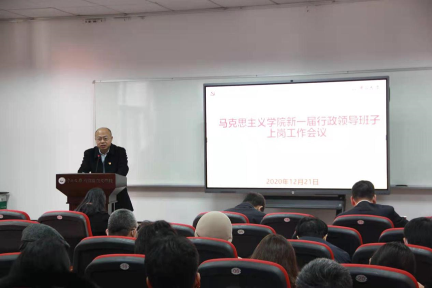副院长沈成飞教授回顾了自己的任职经历,并对学校领导和学院老师表示感谢。他指出,马克思主义学院是服务于国家的大战略平台,承担立德树人的关键职能,需要老师们共同努力,积极付出,为马院的发展贡献力量。