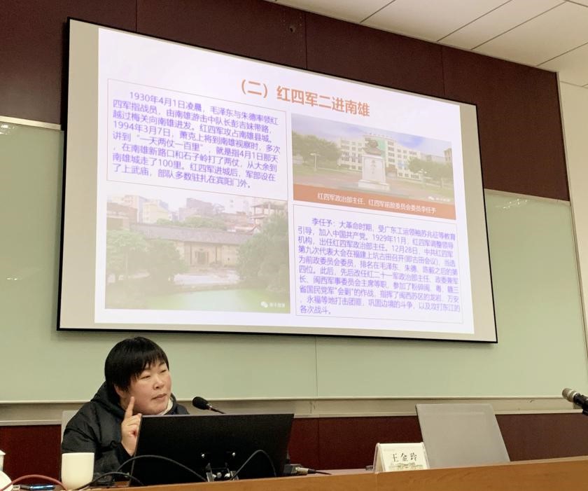开班典礼结束后,中共韶关市委党校党建教研室讲师王金玲主讲专题理论第一课《粤北革命史》。课程主要从起义部队转战韶关、长征红军穿过韶关、留守红军游击韶关三个部分展开,讲述了老一辈无产阶级革命家带领红军部队在粤北地区的战斗历程,重点展示了中央红军长征先后经过南雄、仁化、乐昌三地,突破敌人三道封锁线的光辉历程。课程运用详实的数据、鲜活的案例,诸如“28字游击战术”、“仁化暴动”、“寻乌协定”、“铜鼓岭阻击战”和《梅岭三章》等,让人不禁追忆起那段风云激荡、惊心动魄的革命历史。