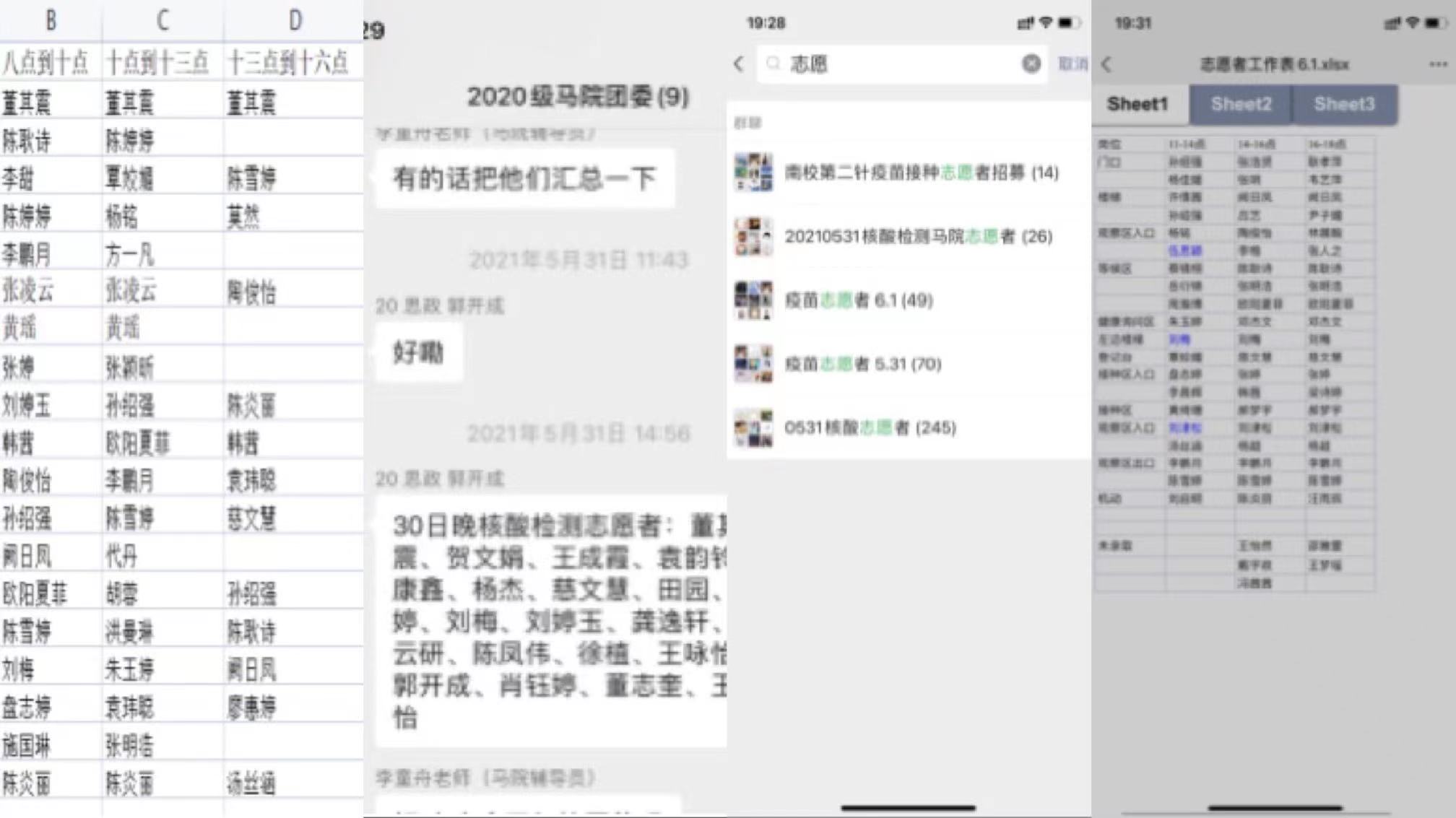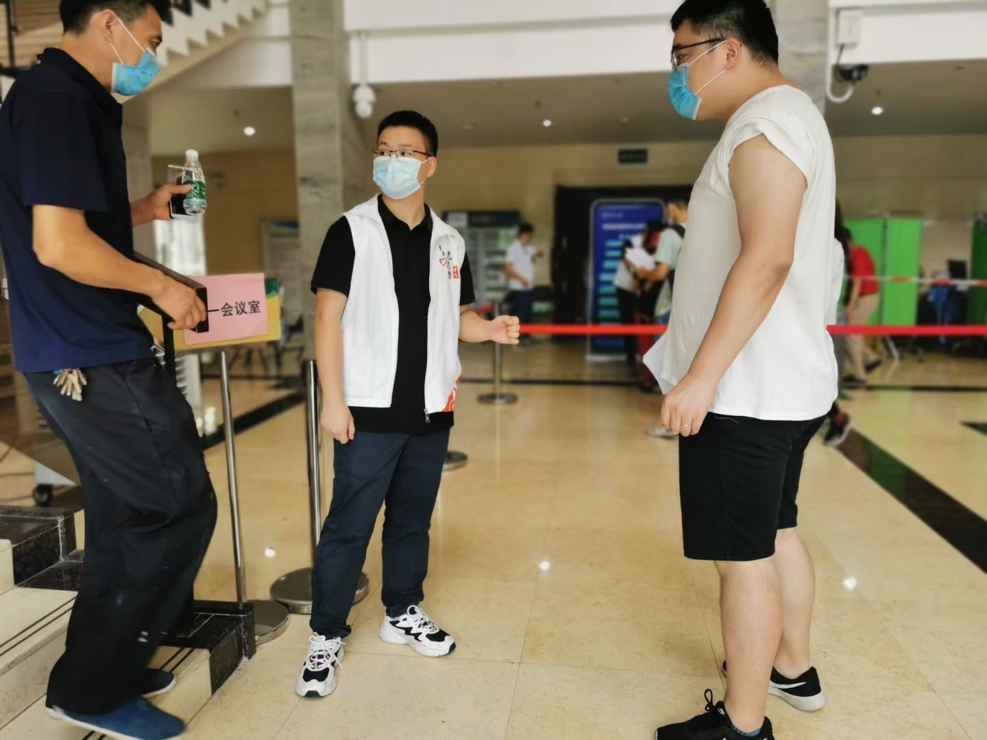 我那天的工作是在大厅负责信息录入和核查,在一遍遍重复的工作中,许多令人感动的画面留在我脑海中:医护人员入场时,全场自发响起热烈的掌声;学校为行动不便的老人专门开设了绿色通道帮助他们快速完成检测;前来检测的人中,有坐着轮椅的老人,也有抱着几个月大小孩的家长。还有很多熟悉的面孔:给我们上过课的老师、宿管阿姨、食堂大叔……不论年龄和身份,大家都能在工作人员的指导下自觉排队,现场井然有序。