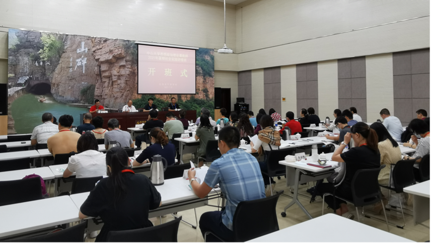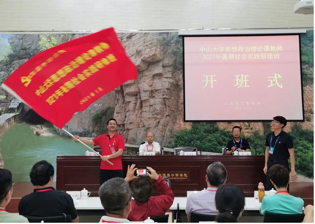 陈海青副院长代表红旗渠干部学院向培训班学员授旗,学员代表、马克思主义学院副院长张浩接旗。全体成员齐唱国歌。根据培训安排,社会实践研修班学员将赴红旗渠纪念馆、青年洞等地开展现场教学、情景教学、访谈教学等活动。