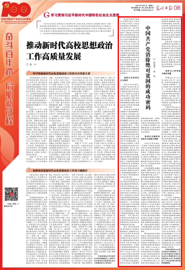 2021年9月8日,《光明日报》第6版刊发我院林进平教授文章《中国共产党消除绝对贫困的成功密码》。