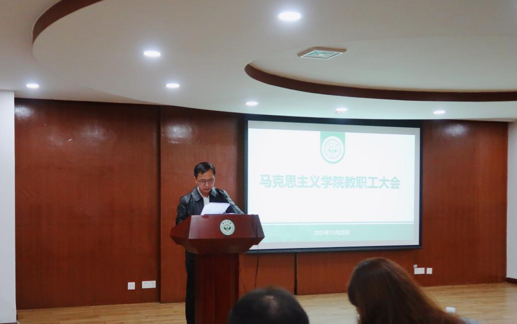 11月22日下午,马克思主义学院教职工大会于文科楼225会议室召开,会议由学院党委书记陈有志同志主持,学院全体教职工参加,大家集体学习党的十九届六中全会精神。