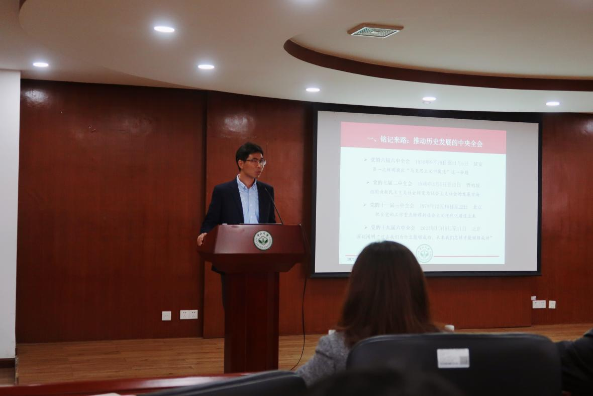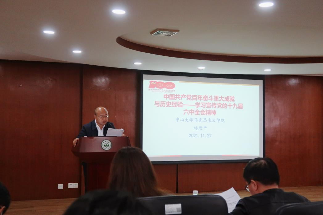 林进平院长做了题为《中国共产党百年奋斗重大成就与历史经验---学习党的十九届六中全会精神》的报告,他阐释了为什么要总结党的百年奋斗重大成就与历史经验、党的百年奋斗重大成就的科学总结、党的百年奋斗历史意义的科学定位、党的百年奋斗历史经验的科学概括、总结党的百年奋斗重大成就与历史经验的特点及意义等问题。他强调,中国共产党百年奋斗的历史征程从根本上改变了中国人民的命运,开辟了实现中华民族伟大复兴的正确道路,展示马克思主义的强大生命力,深刻影响世界历史进程,锻造走在时代前列的中国共产党。