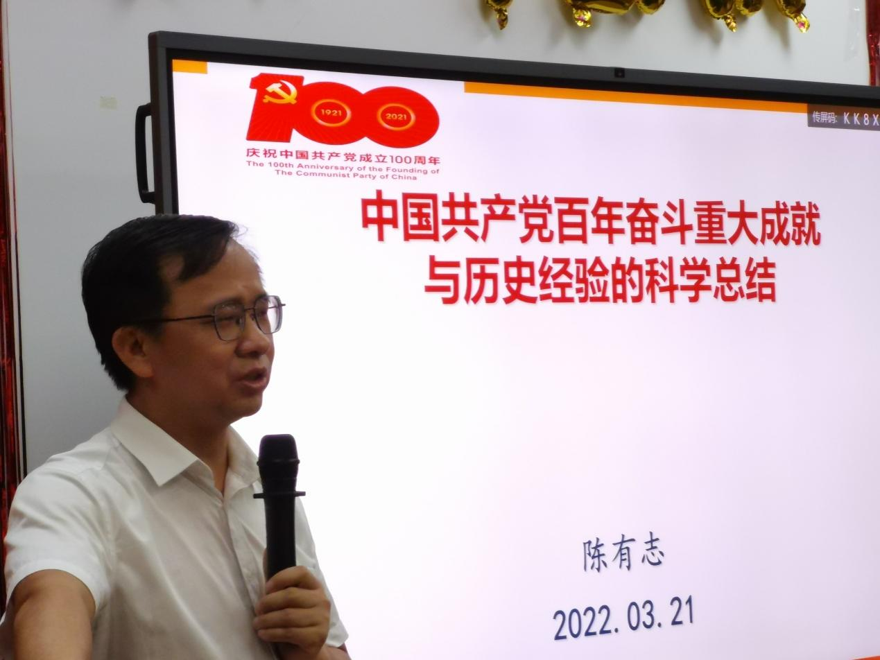 陈有志书记对为什么要总结党的百年奋斗重大成就与历史经验、党的百年奋斗重大成就的科学总结、党的百年奋斗历史意义的科学定位、党的百年奋斗历史经验的科学概括、总结党的百年奋斗重大成就与历史经验的特点及意义五个方面进行讲述。他强调,中国共产党特别重视并善于总结历史经验。《关于若干历史问题的决议》总结了党从成立到抗日战争全面爆发这一时期,特别是党的六届四中全会至遵义会议这一时期正反两方面的斗争经验;《关于建国以来党的若干历史问题的决议》对建国以来党的重大历史问题、毛泽东的历史地位及功过是非、毛泽东思想基本内容与指导意义作了总结和评价;《中共中央关于党的百年奋斗重大成就和历史经验的决议》是一篇马克思主义的纲领性文献,是新时代中国共产党人牢记初心使命、坚持和发展中国特色社会主义的政治宣言,是以史为鉴、开创未来,实现中华民族伟大复兴的行动指南,阐明中国共产党的成功是什么、为什么能够成功、怎样才能继续成功,阐明了中国共产党是什么、要干什么这个根本问题,体现了世界大党的历史自觉、历史自信与历史担当,有利于强化世界大党的形象,为增强“四个意识”、坚定“四个自信”、做到“两个维护”提供历史支撑,有利于统一思想、统一意志、统一行动,凝聚全面建成社会主义现代化强国、实现中华民族伟大复兴的力量,为党的二十大胜利召开作了重要准备。