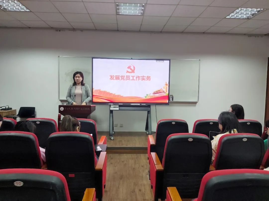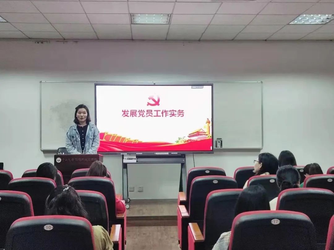 学院学生组织员张姣妹同志做主题分享,从政策制度、工作流程、问题举例以及材料清单四个方面介绍了发展党员工作的具体内容。她详细讲解了发展党员的五个阶段、二十五个环节,并着重强调了要贯彻落实学生党员发展的“三投票五公示一答辩”制度,强调要做好党员发展过程的每一个细节,强调发展过程和材料填写的规范化。
