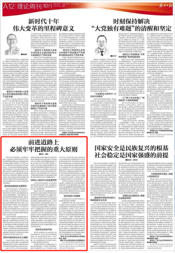 2022年10月24日,《南方日报》第A12版刊发我院张浩教授、博士生廖亮文章《前进道路上 必须牢牢把握的重大原则》。