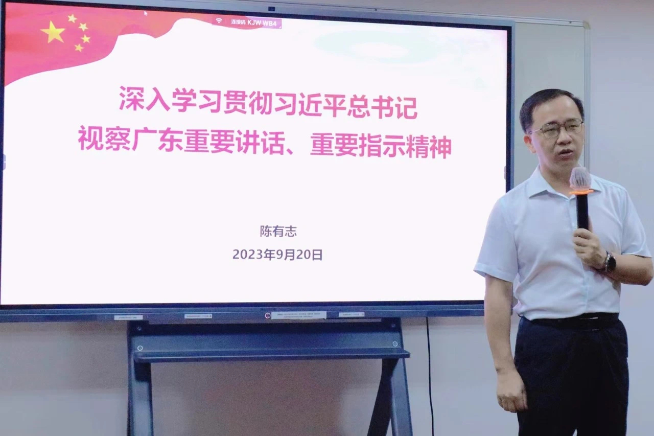 陈有志书记重点阐述了习近平总书记视察广东重要讲话、重要指示精神的丰富内涵。当前国际局势复杂多变,发展和安全的竞争日趋激烈。习近平总书记的重要讲话、重要指示为我们应对复杂多变的国际局势指明了方向,提供了根本遵循。我们要深入领会习近平总书记视察广东重要讲话、重要指示精神的丰富内涵。一是锚定强国建设、民族复兴目标,在高质量发展上走在前列当好示范。二是服务构建新发展格局,使粤港澳大湾区成为战略支点。建设粤港澳大湾区,是习近平总书记亲自谋划、亲自部署、亲自推动的重大国家战略。总书记在视察广东时明确提出,要使粤港澳大湾区成为新发展格局的战略支点、高质量发展的示范地、中国式现代化的引领地。三是加快实现高水平科技自立自强,多措并举构建全过程创新生态链。四是下功夫解决区域发展不平衡问题,加快推动基础设施的区域互联互通。五是全面推进乡村振兴,用心用情做好“土特产”文章。六是全力推动绿美广东生态建设。七是扎实开展主题教育,用好“传家宝”促发展解民忧。