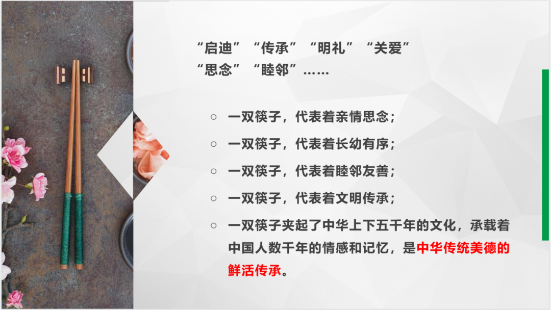 另一方面,用贴近学生生活的方式来讲活道理,避免“宣读文件”式的刻板。如在第五章讲到“传承中华传统美德”时,我以日常生活中的“筷子”为例,引导学生在观看央视视频《筷子》的同时,结合自身的生活体验来提炼、分享“启迪”“传承”“明礼”“睦邻”“守望”等关键词,让学生更加鲜活地体会中华传统美德的蕴涵及其与我们日常生活的交融关系,进而领会中华传统美德传承发展的内在逻辑,自觉做中华传统美德的传承践行者。