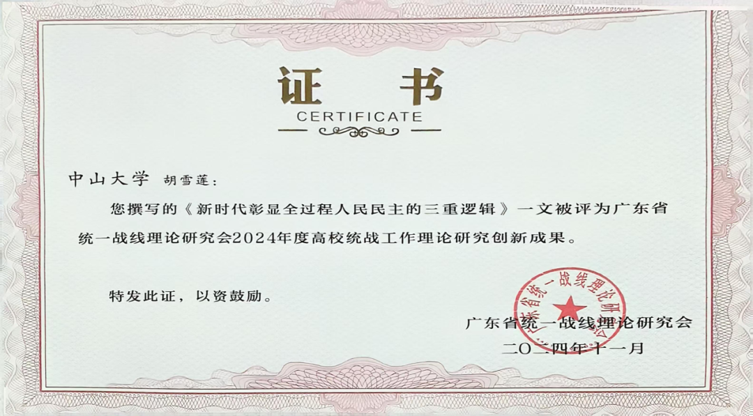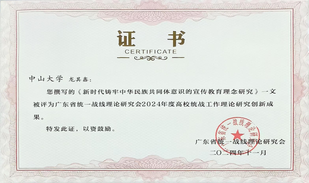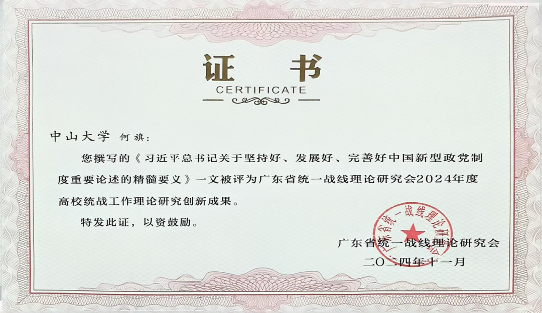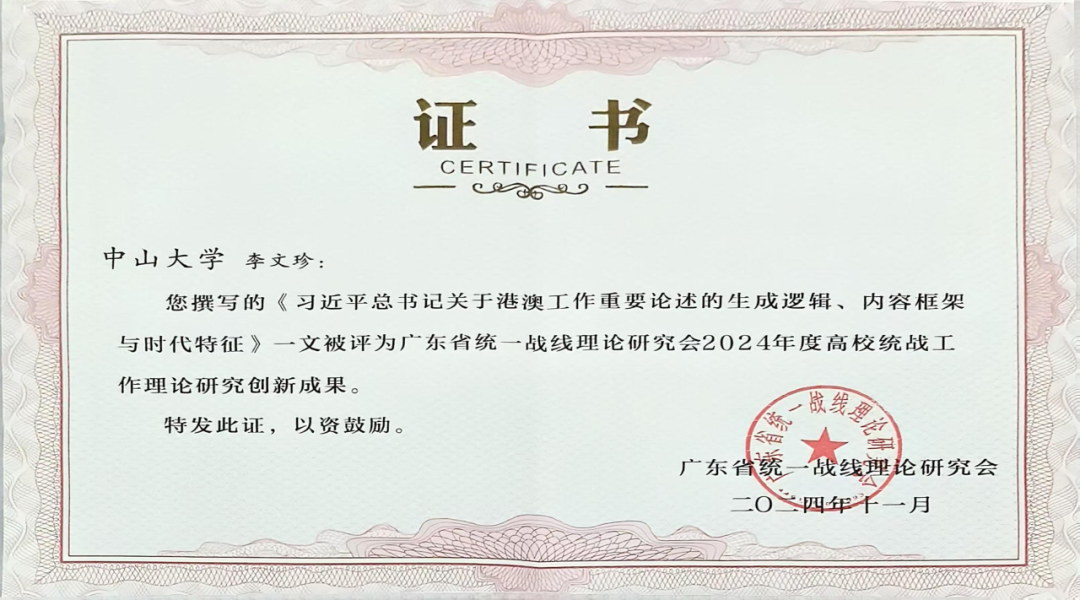 会议对2024年度高校统战工作理论研究创新成果进行表彰并颁发荣誉证书。广东省统一战线理论研究会高校统战工作理论研究委员会评选出创新成果共50篇,其中我校有4篇研究成果荣获“广东省统一战线理论研究会2024年度高校统战工作理论研究创新成果奖”,4篇研究成果均出自我院教师。