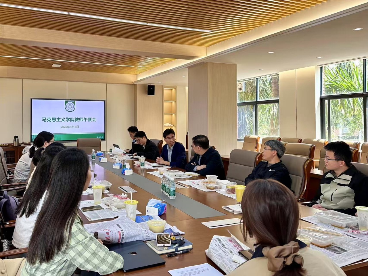2025年4月2日中午,马克思主义学院在文科楼410会议室举办教师午餐会。院长沈成飞教授、党委书记陈有志、副院长童建军教授,以及12位青年教师代表参会。