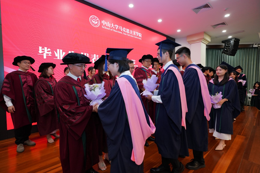 桃李不言,下自成蹊。学生代表为教师献上鲜花,致敬感恩。最后,全场起立奏唱校歌,并共同前往怀士堂前的大草坪拍摄毕业照。至此,马克思主义学院2025届毕业典礼圆满结束。
