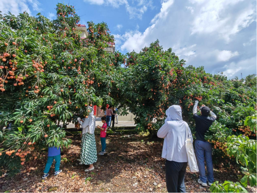 游览之时正值荔枝丰收季,教职工们走进果园,亲手采摘荔枝。在从枝头到舌尖的完整体验中,大家不仅感受到苏东坡笔下“日啖荔枝三百颗”的诗意情怀,更深刻领悟到岭南农耕文明“应时而作”的智慧结晶。这一独特的农事体验,既是对岭南特色农产品的深度了解,更是对“劳动创造价值”这一永恒真理的生动诠释。