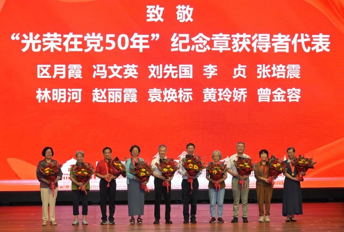 获得“光荣在党50年”纪念章的冯文英老师上台,与会人员用掌声和鲜花向老党员代表致以崇高的敬意。