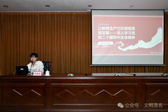 辛海风助理教授在专题宣讲中,紧扣党的二十届四中全会精神内核,聚焦“新质生产力引领高质量发展”时代命题,系统阐释和深入解读党的二十届四中全会的重要意义,系统解读二十届四中全会的战略部署,通过融合百年工运历史智慧与工会服务实践,对于我市工会组织围绕中心、服务大局,动员广大职工为茂名高质量发展贡献智慧与力量提供了方法论指导。现场反响热烈,与会者深感“解渴、提气、明向”,对厘清工会工作发力点极具启示意义。