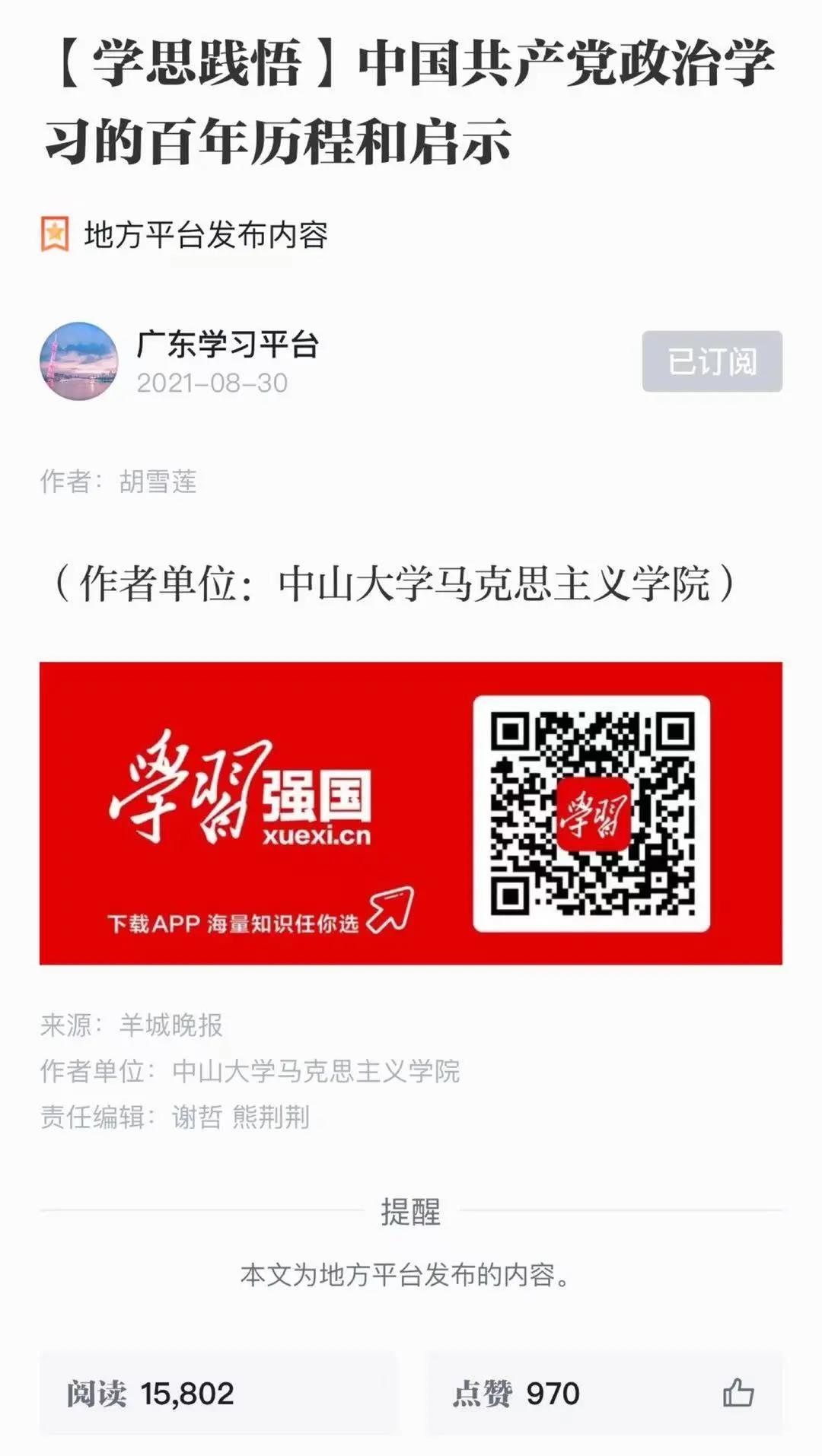 近日,“学习强国”广东学习平台转载我院胡雪莲教授理论文章《