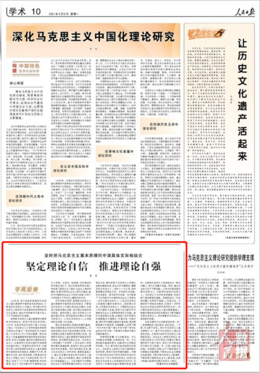 2021年9月6日,《人民日报》第10版刊发我院张浩教授文章《坚持把马克思主义基本原理同中国具体实际相结合 坚定理论自信 推进理论自强》。