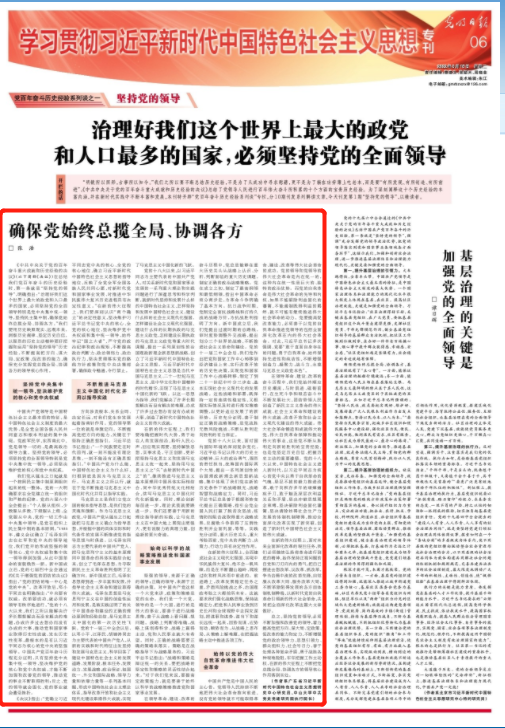 2022年3月15日,《光明日报》第6版刊发我院张浩教授文章《确保党始终总揽全局、协调各方》。
