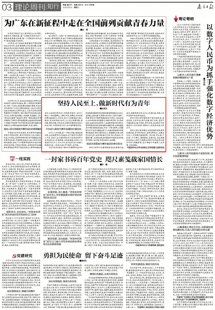2022年5月4日,《南方日报》第A03版刊发我院博士后研究员吴昊天文章《坚持人民至上,做新时代有为青年》。 全文转载如下: 坚持人民至上,做新时代有为青年 吴昊天