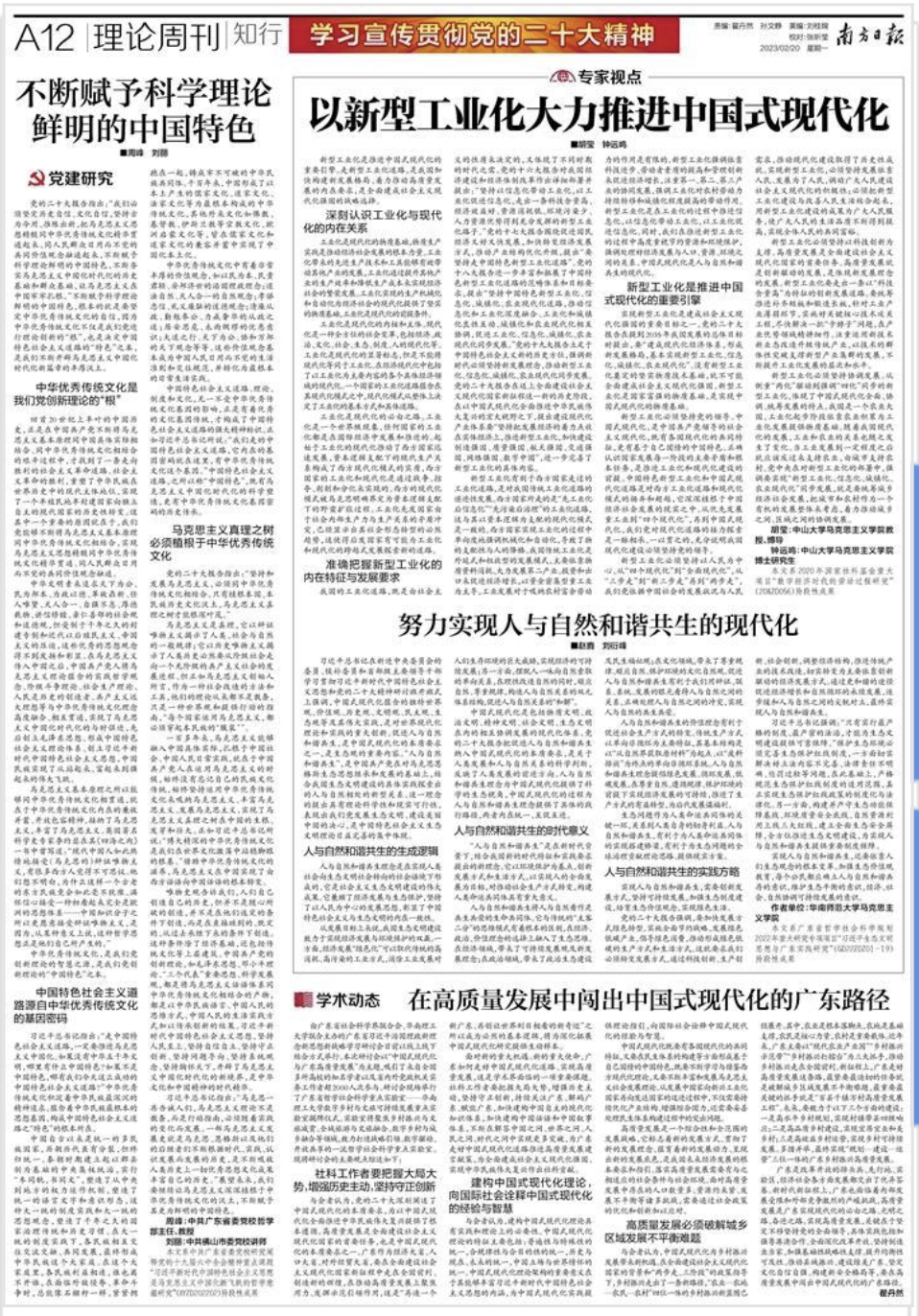 2023年2月20日,《南方日报》数字期刊第A12版刊发我院胡莹教授、博士研究生钟远鸣文章《以新型工业化大力推进中国式现代化》。