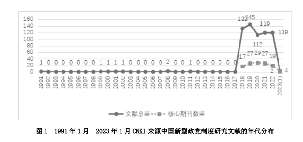 在这一阶段,国内并未出版“新型政党制度”有关论著,相关期刊论文累计发文量只有 8 篇,且许多年份发文量为 0。1991 年,郭尚华在《山西大学师范学院学报(综合版)》上发表题为《对我国新型政党制度的思考》一文。该文从历史与现实双重维度探究“为什么中国必然会选择中国共产党领导的多党合作和政治协商这一新型政党制度”“如何完善我国新型政党制度”。据目前所能掌握文献看,这是国内首篇使用“新型政党制度”一词的专题论文。另从 CNKI 搜索获得以“中国新型政党制度”为题论文中,较有代表性的论文有:《中国新型政党制度的历史必然性与现实必然性》(周秋光,1999)、《中国新型政党制度初探》(谢佑卿,2000)、《中国政党制度是充分体现中国特色社会主义本质要求的新型政党制度》(牟光平,2008)等。此时,少数学者开始从政党制度视角看待中国新型政党制度,并从必然性出发希冀回答“中国为什么能且仅能选择中国共产党领导的多党合作和政治协商制度”这一问题,进而论证这一政党制度“正是中国目前所能找到的最好的政党模式”。但该时期累计发文量较少且多数年份发文量出现“断层”。这反映出在很长一段时期内,学界大都是把中国共产党领导的多党合作和政治协商制度视为我国社会主义制度体系的一项基本政治制度予以考察,并未从学理层面将其视为我国一项不同于西方资本主义国家多党制与其他社会主义国家一党制的新型政党制度进行探究。
