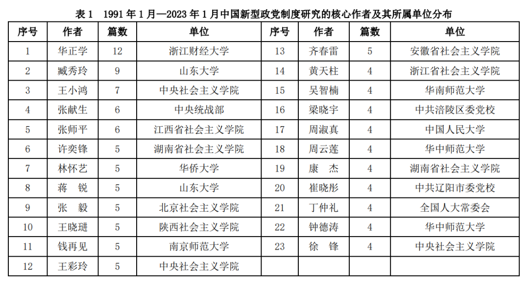 分析作者群与发文期刊等研究力量能帮助我们更好地把握新型政党制度研究现状,同时有利于发现和掌握该领域科研动向。根据普赖斯定律(Price law),同一研究主题中,半数论文为核心作者所撰且核心作者数量约等于全部作者总数平方根,这标志着该研究领域的成熟。据 CiteSpace软件统计显示,中国新型政党制度领域作者最高发文量为 12 篇,因此取发文量≥4 篇的前 23 名核心作者群进行考察(如表 1 所示)。核心作者共发文 120 篇,约占总量的 18.8%。这表明中国新型政党制度研究领域的核心作者群尚未形成,该研究领域仍处于发展阶段。从核心作者群所属机构来看,集中为党校、社会主义学院与高校中的马克思主义学院、政治学院等两大类。另据 NoteExpress 软件统计显示,中国新型政党制度领域 639 篇文章涉及作者 611 人,多数研究者属于独立进行研究,显示作者间的合作关系较弱,呈现出各自为战的状况。