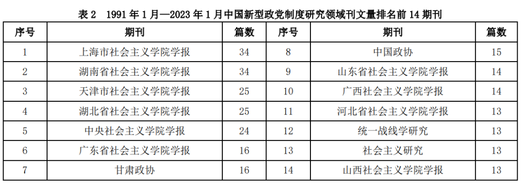文献来源期刊的层次和质量反映学术共同体对该领域的研究程度。据 NoteExpress 软件统计显示,中国新型政党制度研究领域涉及期刊 183 种,刊文量前 14 的期刊如表 2 所示。它们累计发文 269篇,约占总文献的 42%。与核心作者群所属机构集中于社会主义学院、党校相对应,中国新型政党制度研究领域的期刊也多集中为社会主义学院学报、政协与各民主党派主办的期刊。它们大都围绕中国新型政党制度策划专题栏目,如《上海市社会主义学院学报》自 2019 年起便开设“新型政党制度专题”,《中央社会主义学院学报》于 2018 年第 5 期、2022 年第 2 期分别设置“新型政党制度”研究专题,体现出学界对新型政党制度与统一战线工作联系的密切关注。重庆社会主义学院主办的专业学术期刊《统一战线学研究》,持续对新型政党制度研究论文进行策划和出版。但多数专业度高、权威性较强的学术期刊并未开设相关专栏探讨中国新型政党制度,多是在相关政治学研究与党建研究专题下进行零星探讨,高层次研究成果仍偏少。