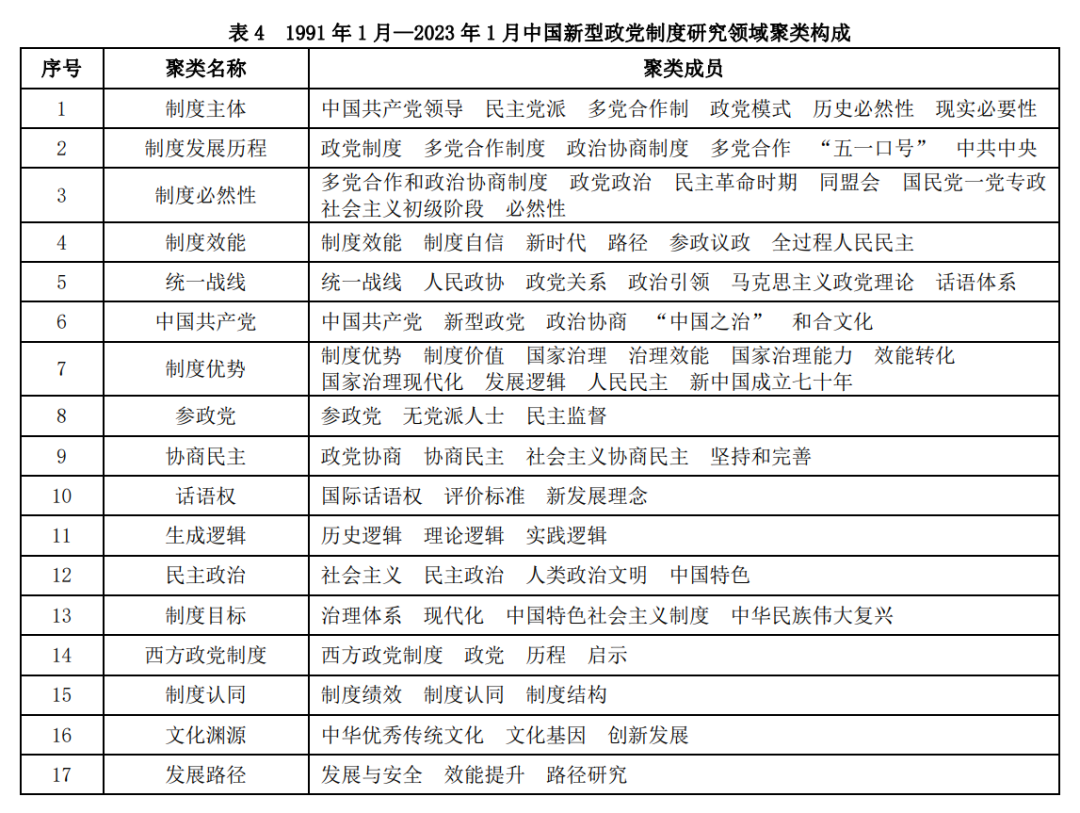 为对中国新型政党制度的研究前沿和趋势认知更加清晰,本文借鉴 Callon 等构建子簇的方法,将基于 CiteSpace 所得的 126×126 关键词共现矩阵划分为 26 个聚类。考虑到由两个关键词构成的聚类难以准确地反映其代表的研究方向和内容,因此删除这类聚类,最终得到有效聚类 17 个。每个聚类根据其所包含的关键词,概括出聚类的名称。17 个聚类代表了中国新型政党制度研究领域当前的主要研究内容和方向,具体如表 4 所示。