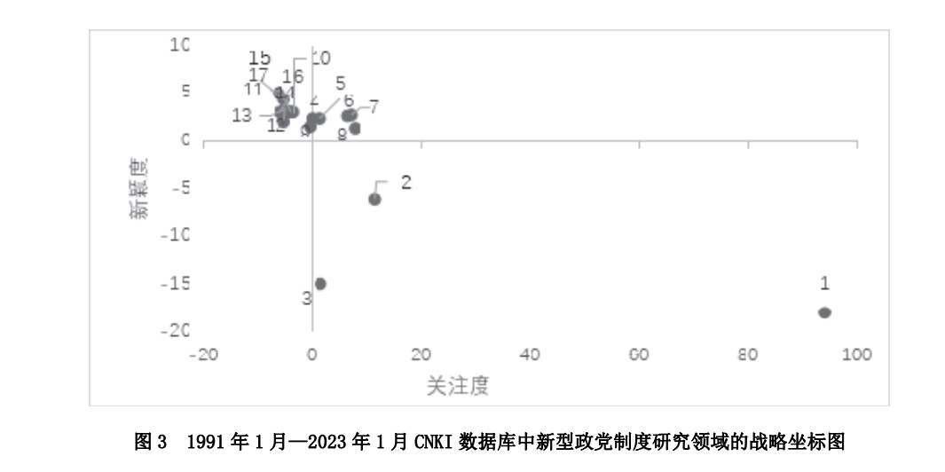 第三类是潜在型研究热点。潜在型研究热点位于战略坐标图第二象限。该象限的 9 个聚类关注度<0,而新颖度>0,表明其所代表的内容是 1991 年 1 月—2023 年 1 月期间在中国新型政党制度研究领域潜在的研究热点。这些研究热点或将成为今后研究关注的重点领域。其具体包括“协商民主”“话语权”“生成逻辑”“民主政治”“制度目标”“西方政党制度”“制度认同”“文化渊源”“发展路径”等相关内容。