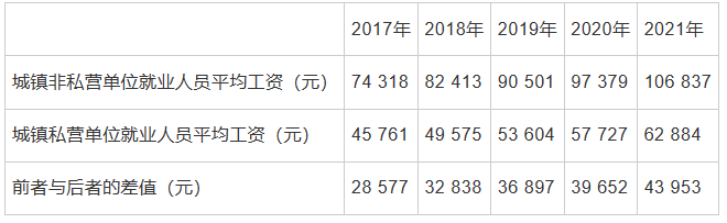 表 1 中国城镇非私营单位与私营单位就业人员平均工资及其差值对比(2017-2021 年)