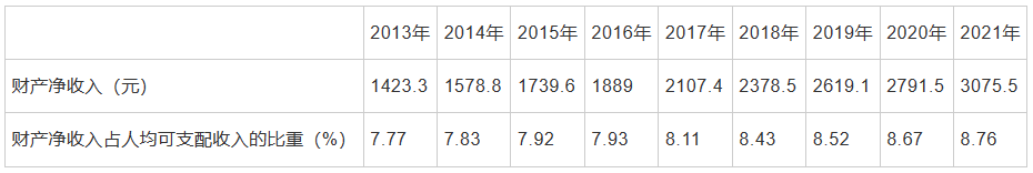 表 3 中国居民财产净收入在人均可支配收入中的比重(2013—2021 年)