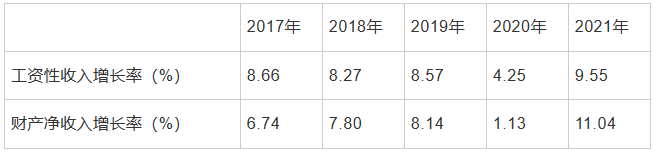 表 4 中国居民工资性收入增长率与财产净收入增长率的比较(2017—2021 年)