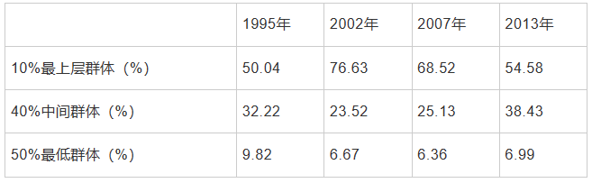 表 5 中国不同群体财产净收入份额的比较(1995—2013 年)