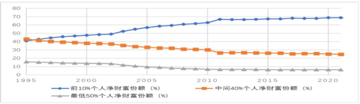 图 1 中国不同收入群体拥有的财富份额(1995—2021 年)