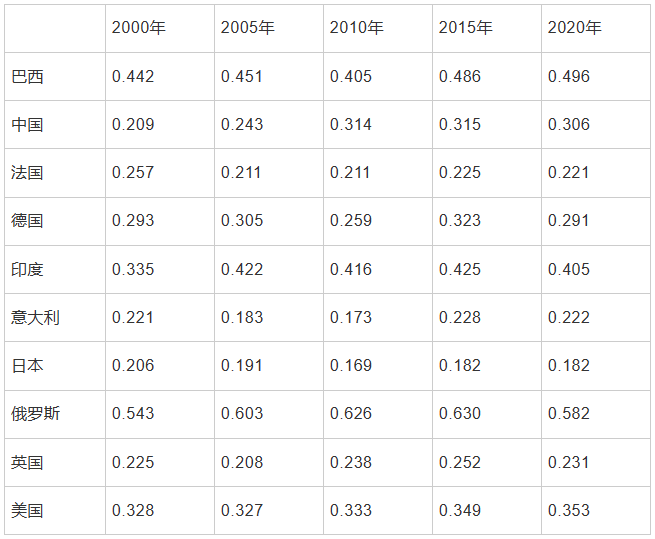 表 6 部分国家最富1%群体所占财富份额(2000—2020 年)