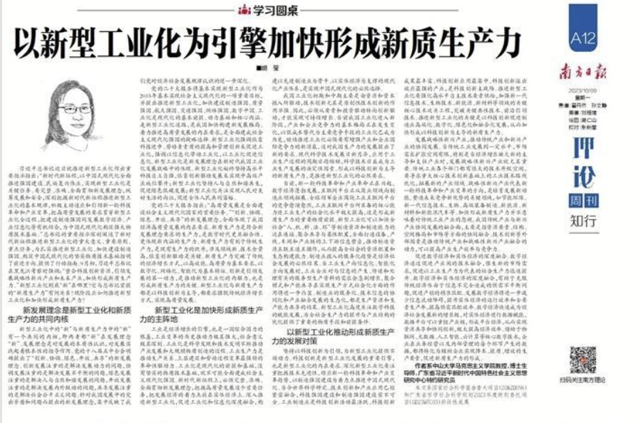 2023年10月9日,《南方日报》A12版:理论周刊·知行刊发我院胡莹教授文章《以新型工业化为引擎加快形成新质生产力》。