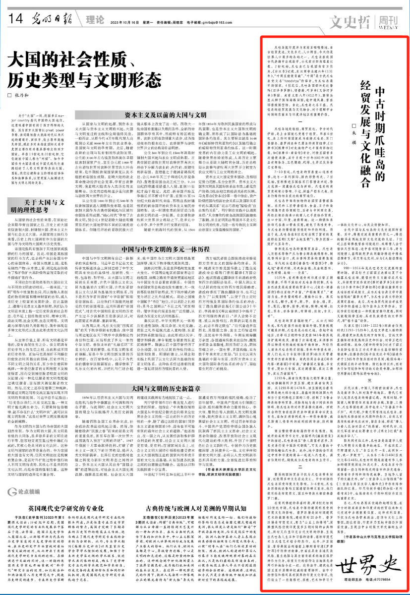 2023年10月16日,《光明日报》第14版(理论版)刊发我院助理教授朱祺文章《中古时期爪哇岛的经贸发展与文化融合》。
