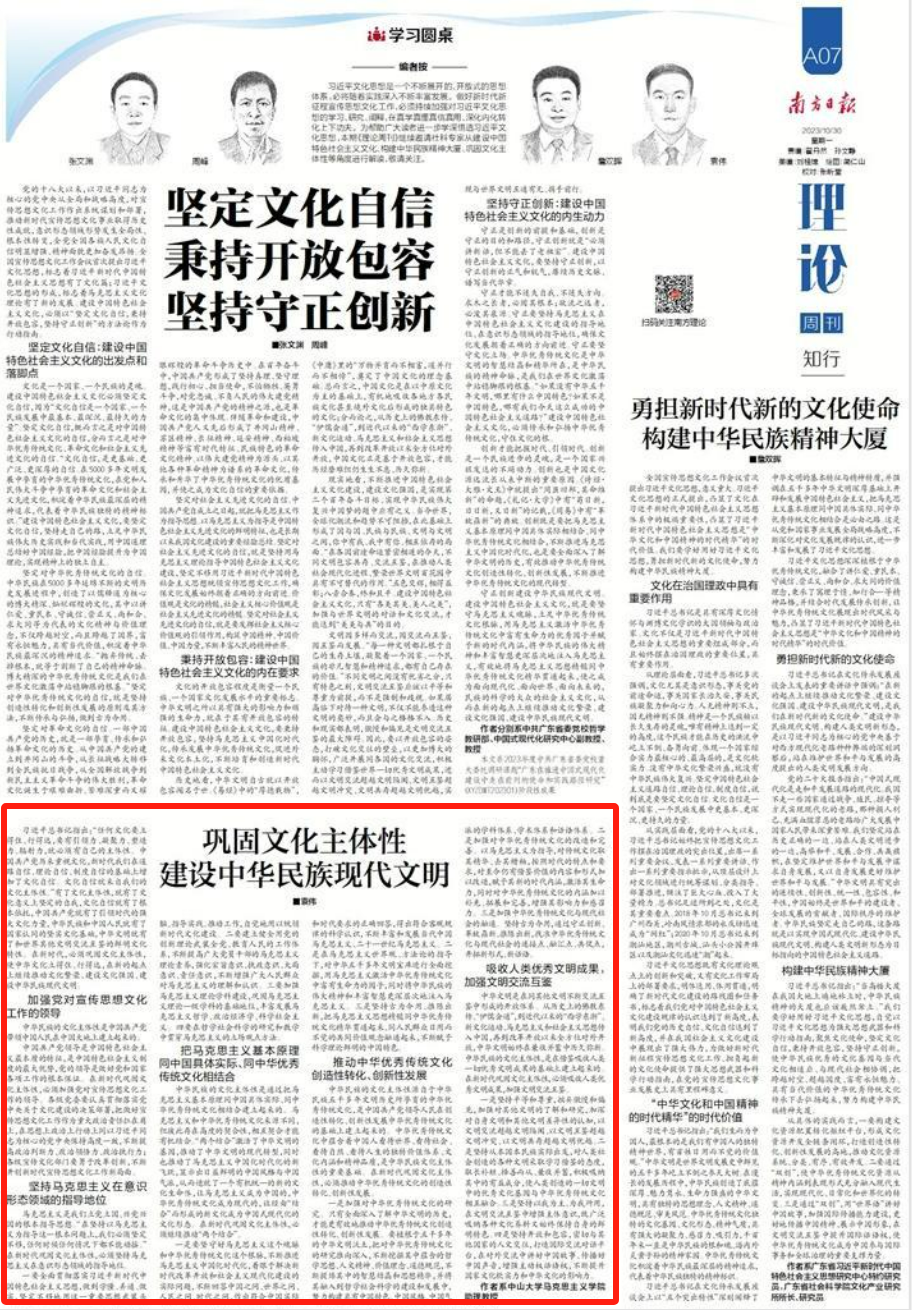 2023年10月30日,《南方日报》第A07版刊登我院助理教授袁伟文章《巩固文化主体性 建设中华民族现代文明》。