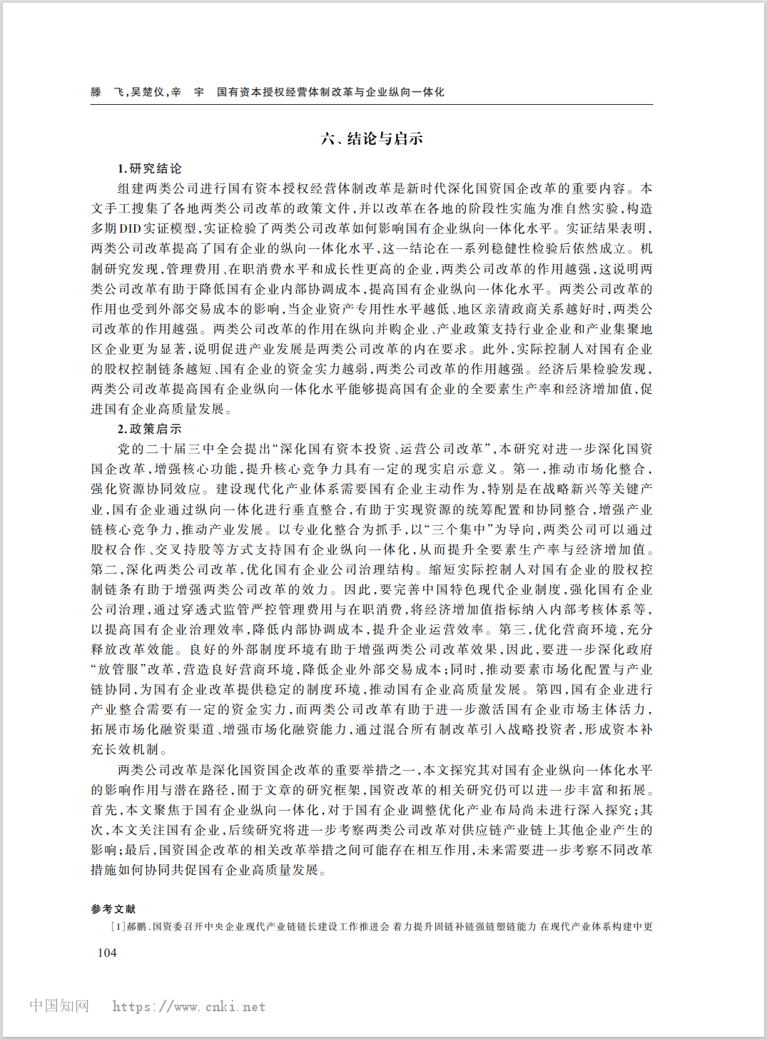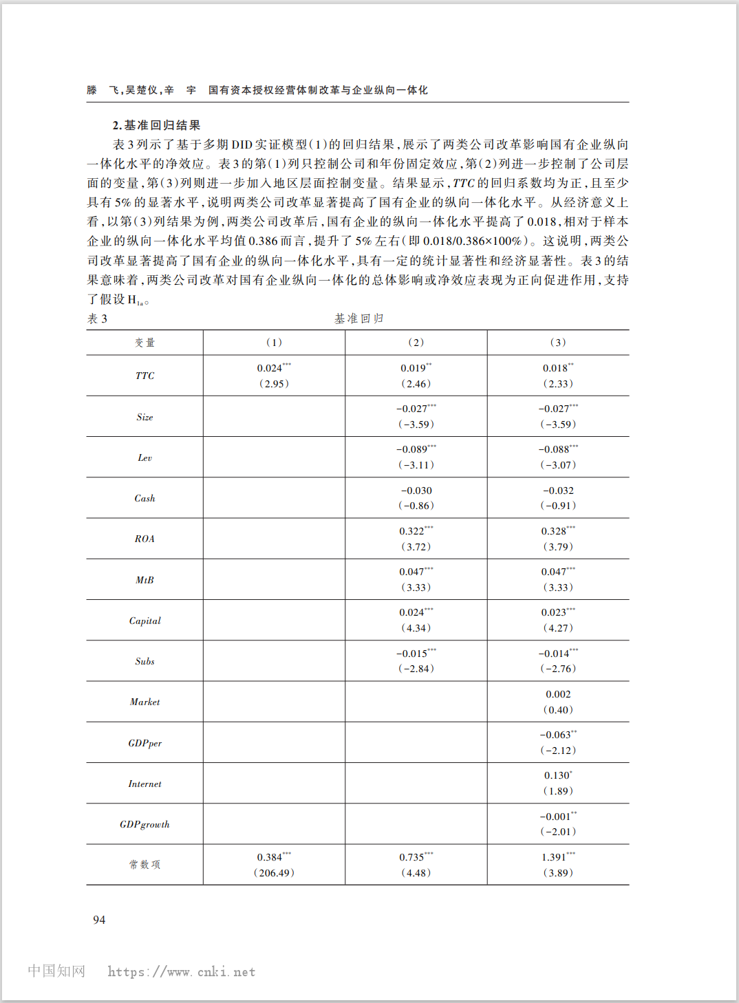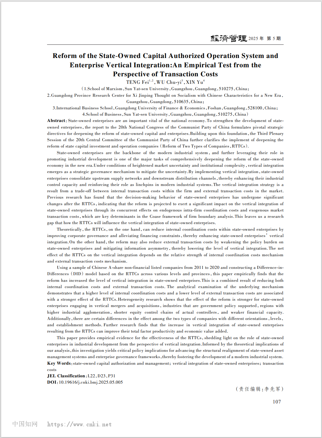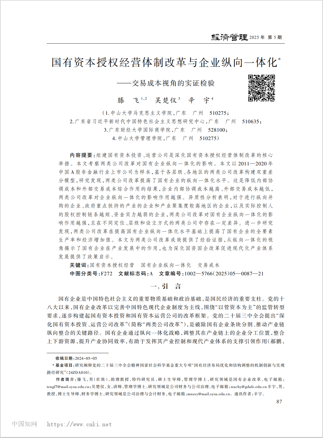 荐读 | 滕飞、吴楚仪、辛宇《国有资本授权经营体制改革与企业纵向一体化——交易成本视角的实证检验》