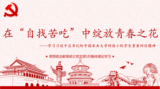 5月30日,思政硕士党支部以“在‘自找苦吃’中绽放青春之花”为主题开展集体理论学习,支部党员陈德辉作领学分享。