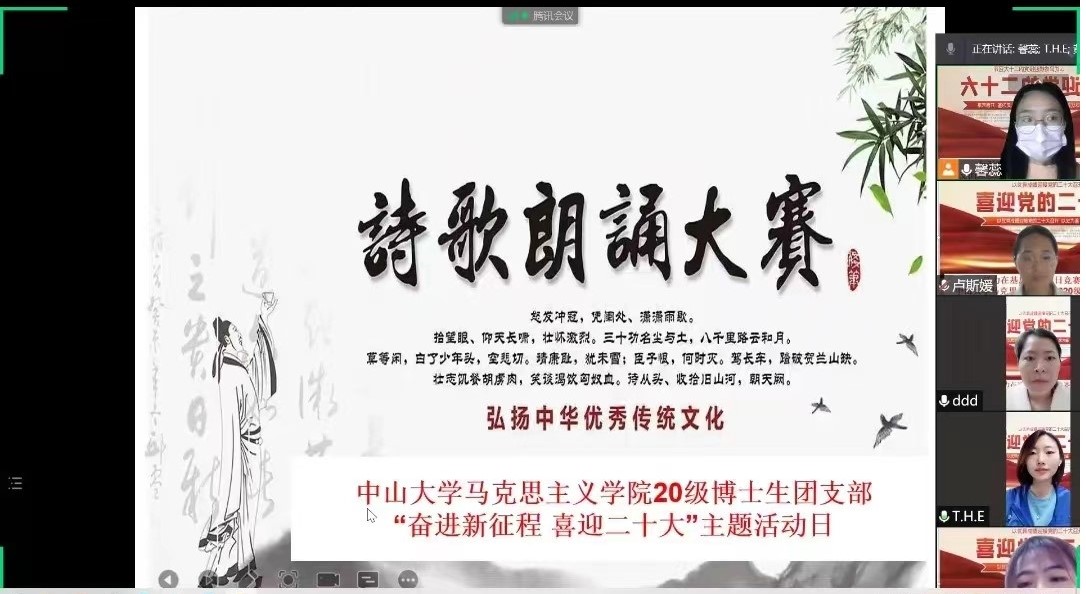 广州疫情期间本支部活动以线上朗诵为主线、线下交流和作品展示为辅助。同学们在本次团日活动中积极参与,展示了支部成员的风貌,通过多种作品传诵了百年大党的风雨历程,歌赞党和国家,作品分组展示,取得了良好的反响。