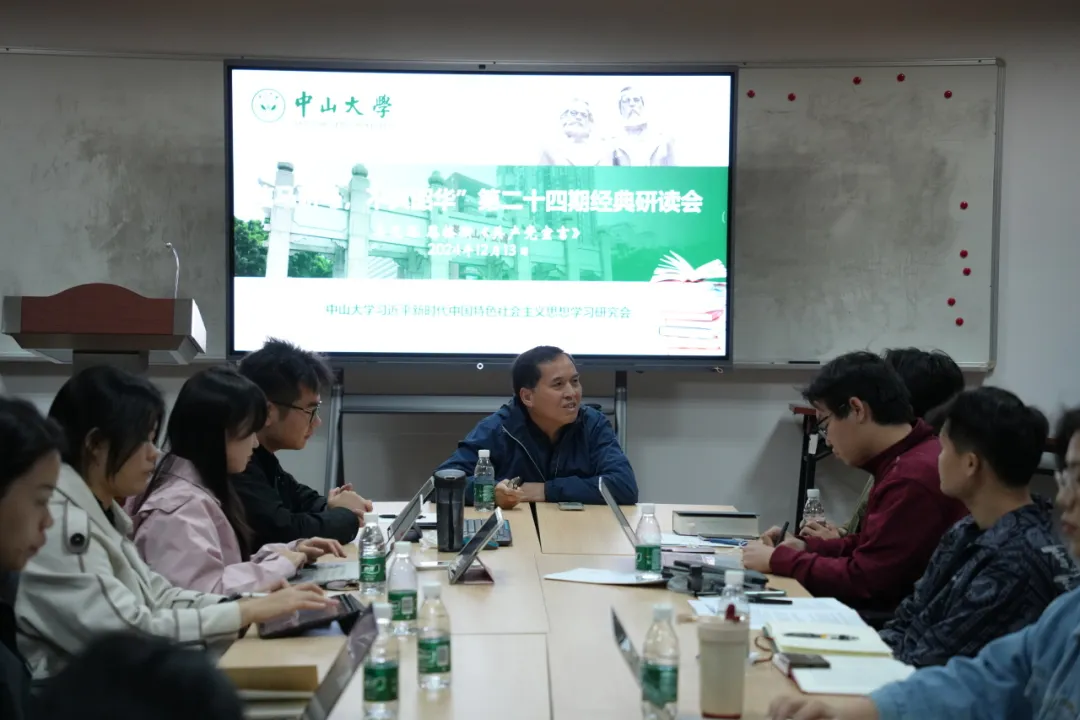 2024年12月13日晚,304am永利习近平新时代中国特色社会主义思想学习研究会(以下简称“学习会”)在文科楼223室举办了第二十四期马克思主义经典著作研读活动,研读书目为《共产党宣言》(以下简称“《宣言》”)。本次活动邀请吴育林教授主讲,刘勇副教授、柳成雅助理教授和陈颖助理教授与谈,2024级硕士谢娇、李泽儒两位同学领读,20余名同学参与了本次研读活动。