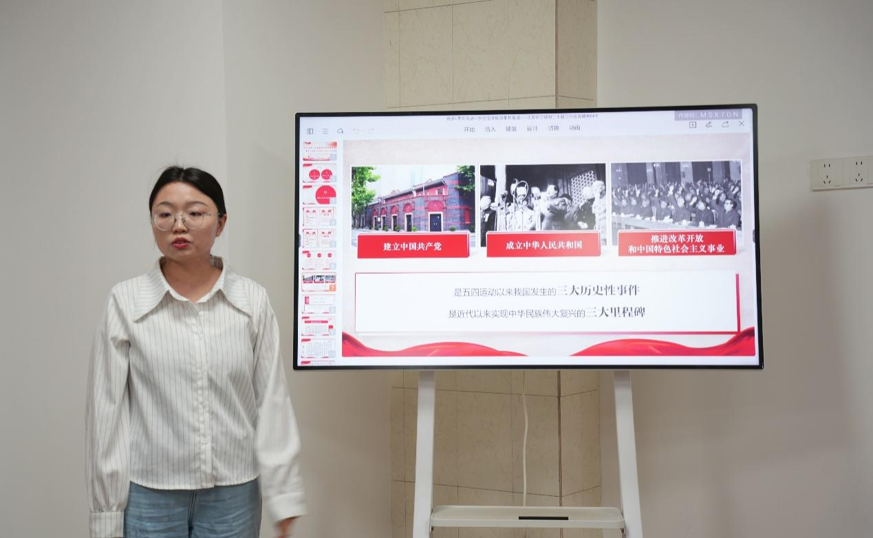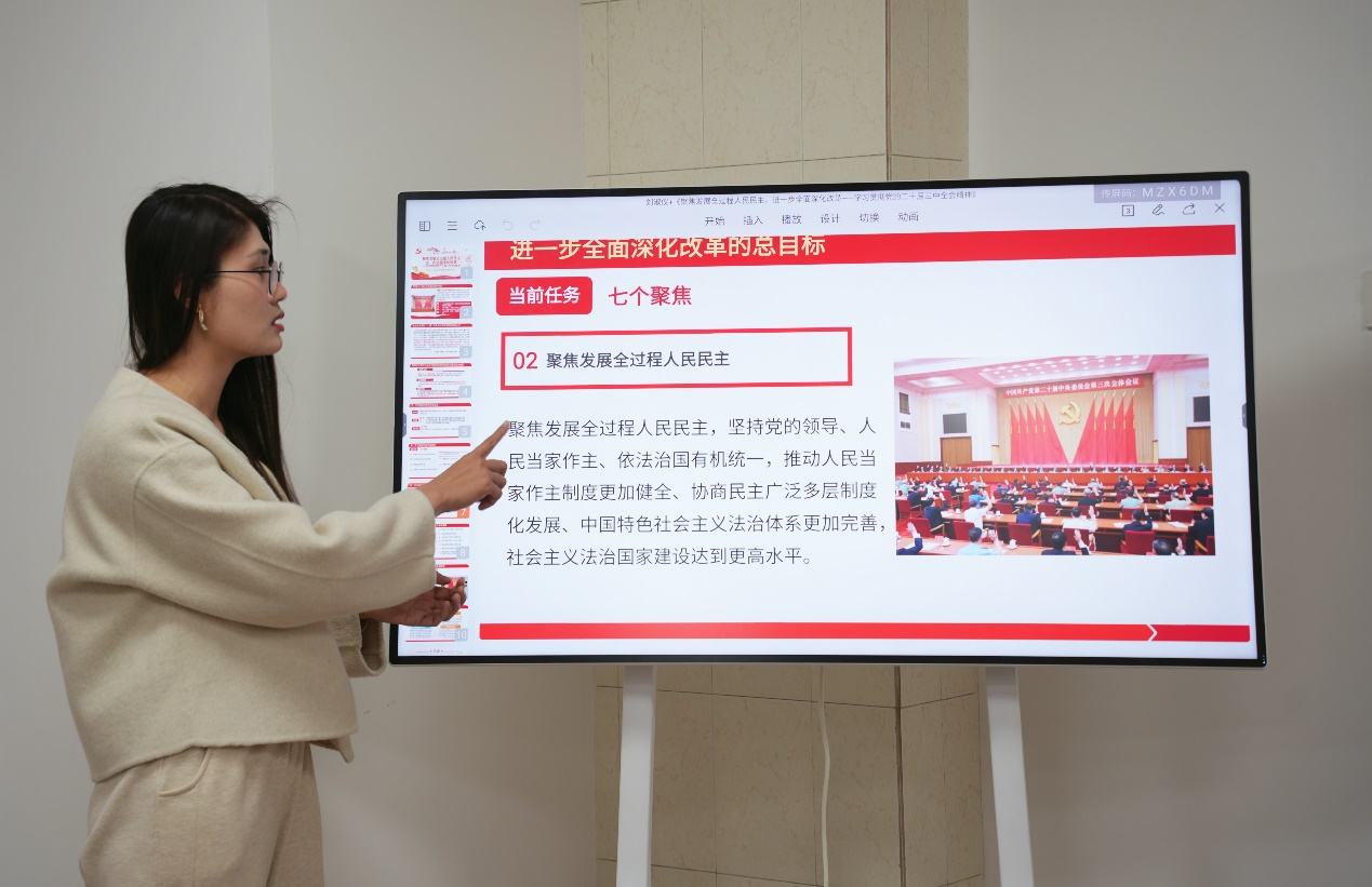 周干兵以《深入学习贯彻习近平文化思想——中华戏曲文化持续焕发时代光彩》为题,巧妙选取传统戏曲文化为切口,学习贯彻习近平文化思想。赵建宇以《深研实查明方向,求真务实促发展——新时代开展调查研究的实践路径及其方法论意义》为题,对原有内容进行了深化与延展,阐述如何把调查研究做好。黄佳慧以《出新·出圈·出海——坚定文化自信,讲好中国故事》为题,结合近期的文化现象热点生动回答了“如何讲好中国故事”的问题。汤洲以《坚持理论创新,为进一步全面深化改革提供强大思想武器》为题,在初次备课会交流后加入了前言,介绍了“创新”的词源与涵义发展,并进行了提前演练。苏琦童以《以进一步全面深化改革推进中国式现代化——学习领会党的二十届三中全会精神》为题,补充了鲜活案例,精简了冗余内容。侯玉童以《以党史涵育青年党员党性》为题,从党性内涵、青年党员党性涵养的现实需求以及如何学习党史、坚守党性出发进行讲述。邹阳以《人民监督和自我革命—中国共产党找到跳出历史周期率的“两个答案”》为题,对宣讲内容中涉及的概念进行了进一步的界定与分析。张泽扬以《青年党员与党纪教育同行》为题,对原有宣讲内容的详略进行了调整。廖亮以《春雷响遍神州地,敢为人先立新篇——新时代广东改革开放成就与展望》为题,更新了部分数据,同时加入了自身案例论证所述内容。刘淑仪以《聚焦发展全过程人民民主进一步全面深化改革——学习贯彻党的二十届三中全会精神》为题,阐述了全过程人民民主的生成脉络、理论意蕴与制度优势。高妍以《青年与进一步全面深化改革共奋进——认真学习贯彻党的二十届三中全会精神》为题,全面介绍党的二十届三中全会内容,并深入阐述了全面深化改革的历史和成就。此外,高妍还从党史发展的角度同大家分享了题为《扎根中国大地,争做时代有为青年》的新内容。谌映君以《解码“三个务必”青春答卷——新时代新青年成长成才的必修课》为题,新增了视频导入环节,并在其他部分加入新案例,以此促进听众进入青年人的角色。冯雨奇以《新质生产力如何促进共同富裕》为题,深入阐释了共同富裕与新质生产力的内在联系,以及新质生产力如何促进共同富裕。