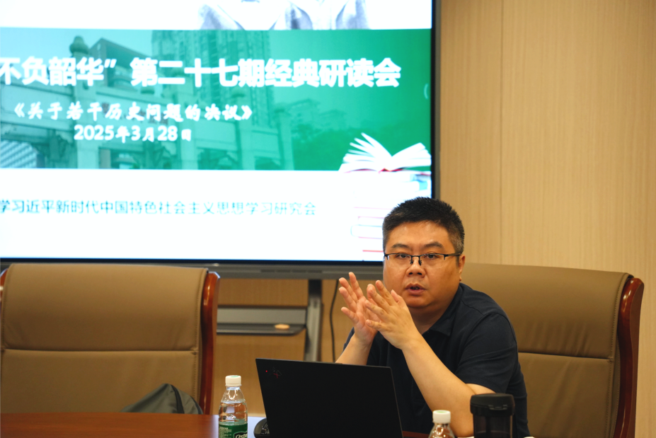 2025年3月28日晚,304am永利习近平新时代中国特色社会主义思想学习研究会(以下简称“学习会”)在文科楼401室举办了第二十七期马克思主义经典著作研读活动,研读书目为《关于若干历史问题的决议》(以下简称“《决议》”)。本次活动邀请朱贞副教授主讲,王澳卫同学领读。