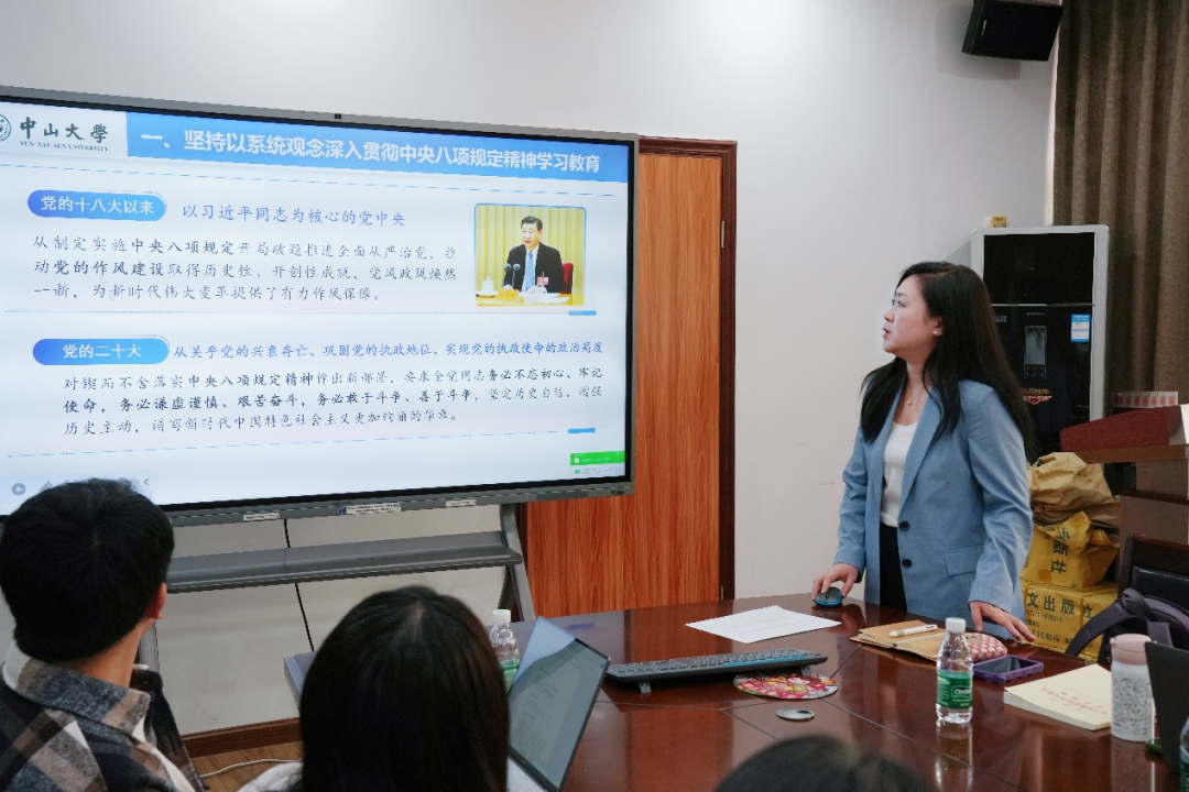 博士生廖亮同学进行了备课成果分享。他以中国古代历史事件引入,从历史的角度看作风建设的重要作用,并结合党史,为听众搭建起理解中央八项规定精神重大现实意义的桥梁,使抽象的理论变得鲜活生动、易于理解。随后,他结合一系列违反中央八项规定精神的典型案例,指出作风建设与反腐败斗争的关系,强调党风问题关系人心向背,关系党的生死存亡。作风建设永远在路上,要锲而不舍落实中央八项规定精神。