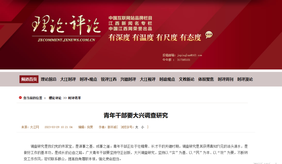 一句“不接地气”如当头棒喝,惊醒了我,也开启了一个所谓“束之高阁的理论学者”向接地气的理论宣传者的转变。作为一名基层工作者,应当明白理论不是空中楼阁,而是要“飞入寻常百姓家”。此后,我便开始学习理论宣传文章的撰写,将大半年来的基层工作经历涵化于文字之间,将对沉塘群众朴素的情感注入文稿之中,逐步将基层工作总结升华、赋予理论基层鲜活生命,坚持把文章写在沉塘村的土地上。不破不立,很快,第一篇《青年干部要大兴调查研究》于三月份发表在大江网理论评论频道。此后陆陆续续在大江网理论评论和新闻等频道也发表相关文章十余篇。